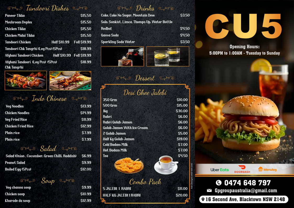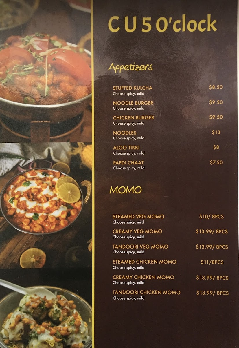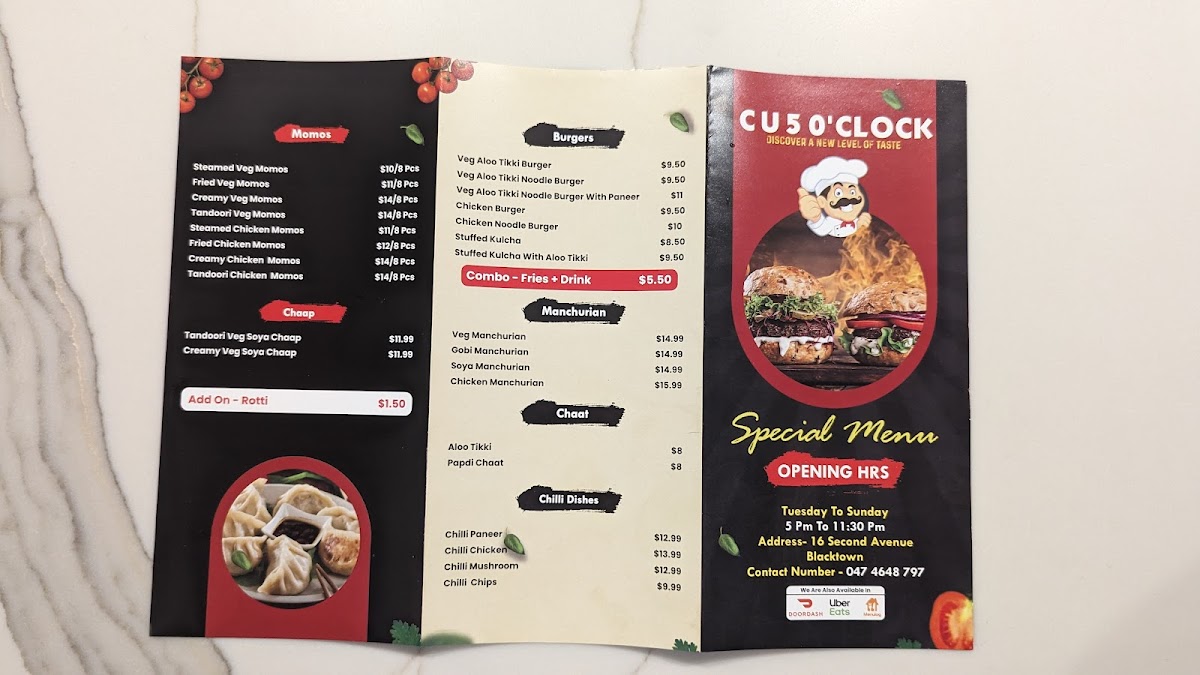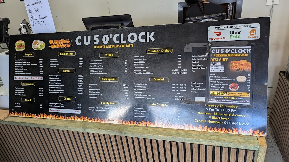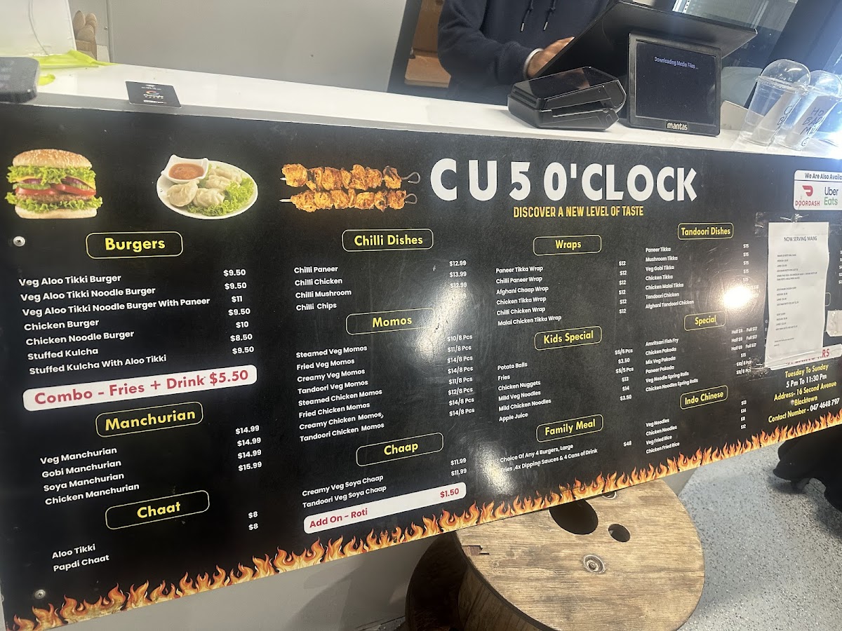 Welcome to CU5O'CLOCK, where culinary creativity meets comfort food in the heart of Blacktown! Located at 16 Second Ave, our unique menu is bursting with flavors that invite you to indulge in some truly delightful specialties. Satisfy your cravings with our standout Noodle Burger, a delicious fusion that you won't want to miss. Or try the spicy Chilli Chicken and savory Tandoori Chicken Momo for a taste of our bold flavors. For those looking for lighter bites, our Veg Spring Rolls and Aloo Tikki Chaat make for perfect appetizers. Don’t forget to grab a Chicken Roll for a quick and tasty meal on the go, and treat yourself to the luscious Gulab Jamun for dessert. Come explore the CU5O'CLOCK Menu and discover your new favorite dish!